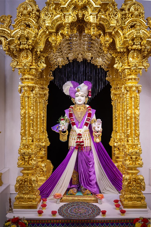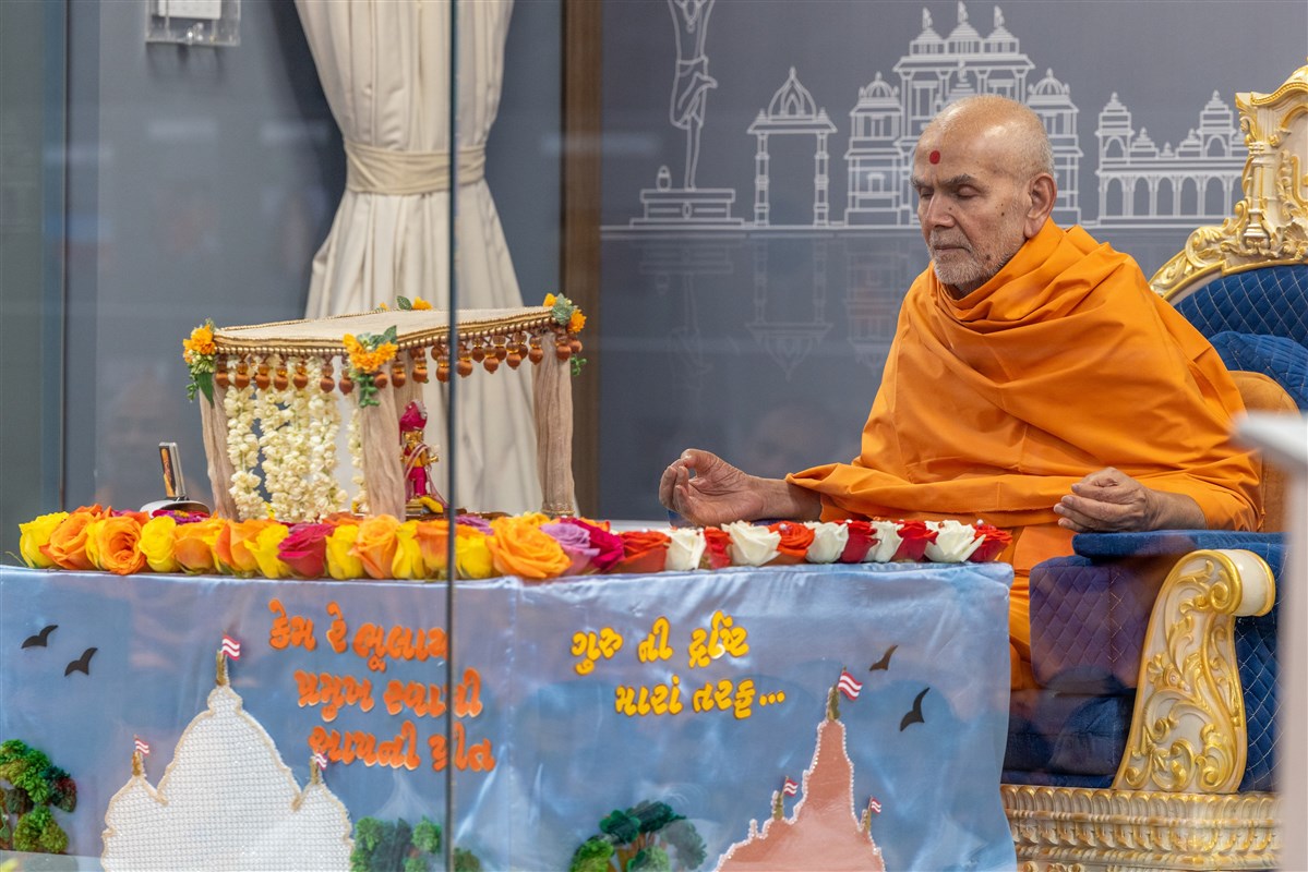 Swamishri offers thal to Shri Akshar Purushottam Maharaj