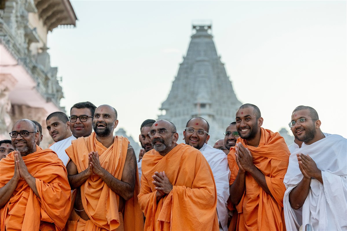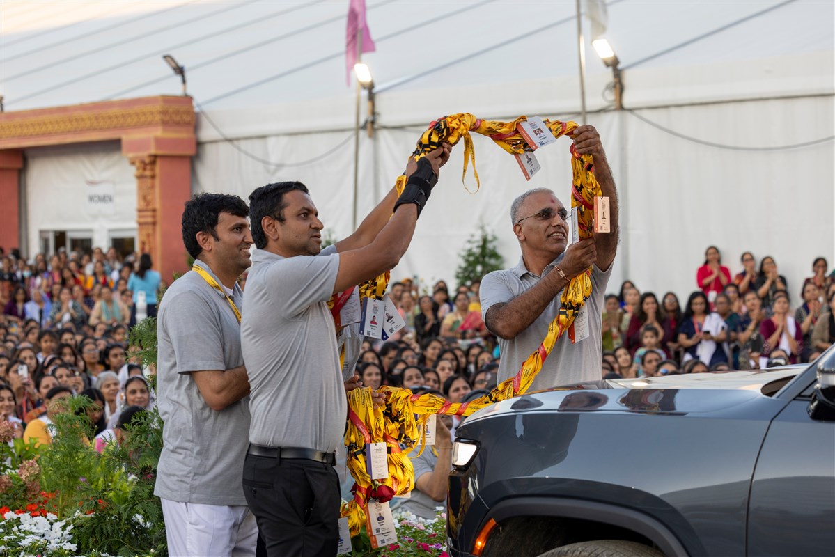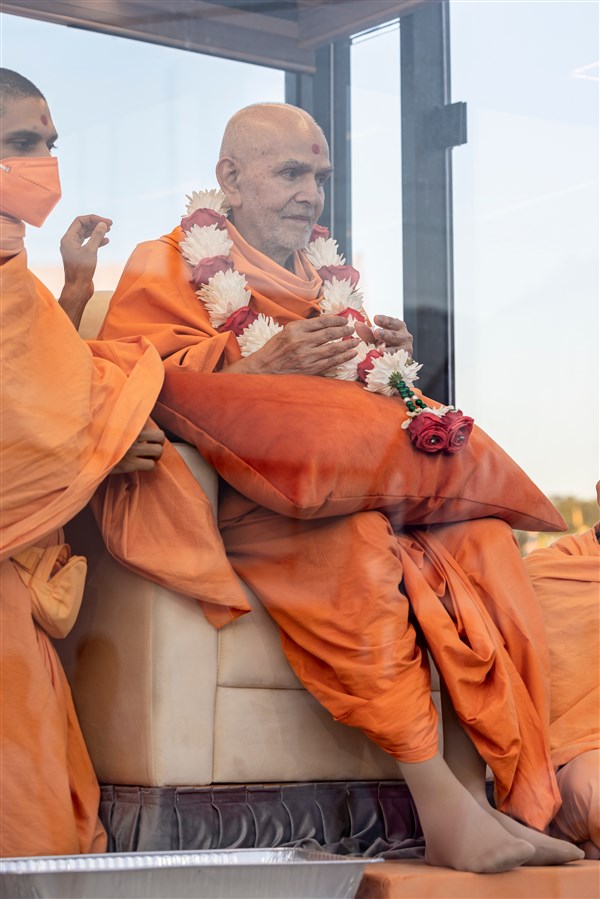 Param Pujya Mahant Swami Maharaj arrives at the mandir for morning darshan