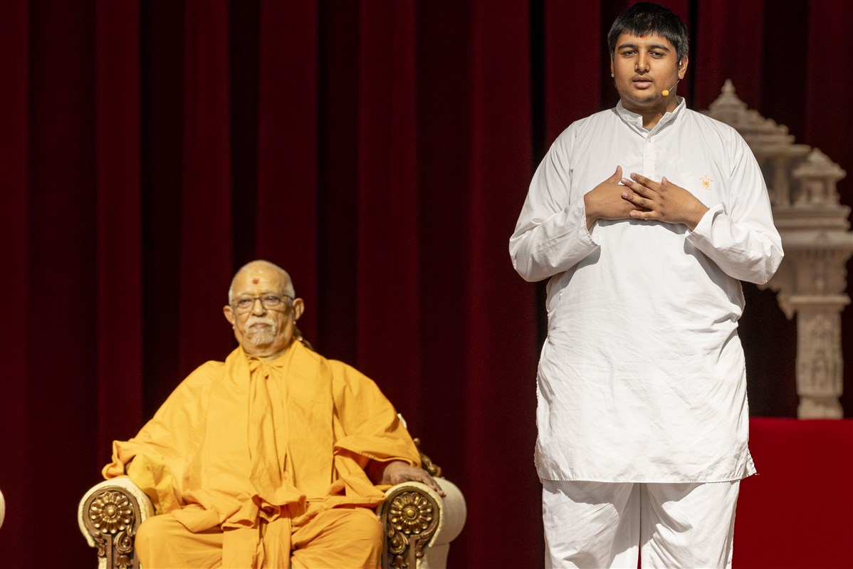 A child leads everyone in reciting the sadhana mantra and daily prayer in Swamishri's puja