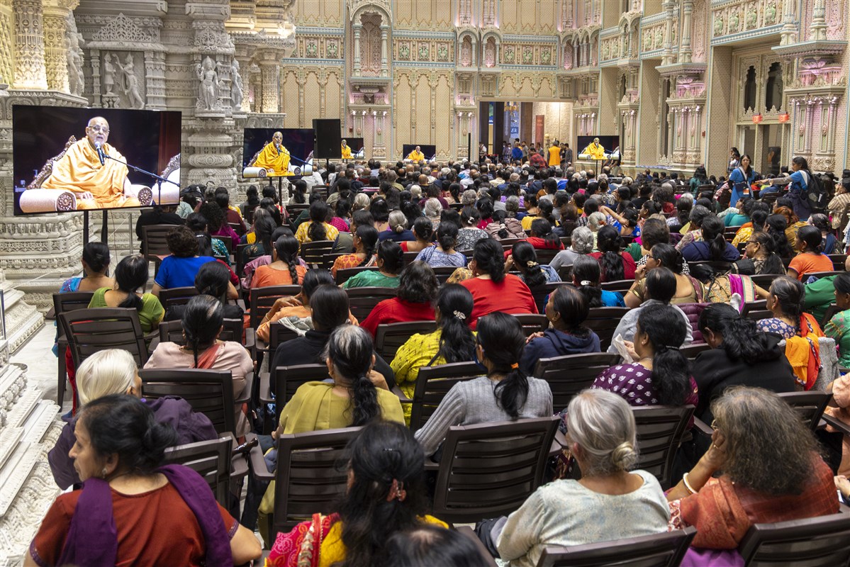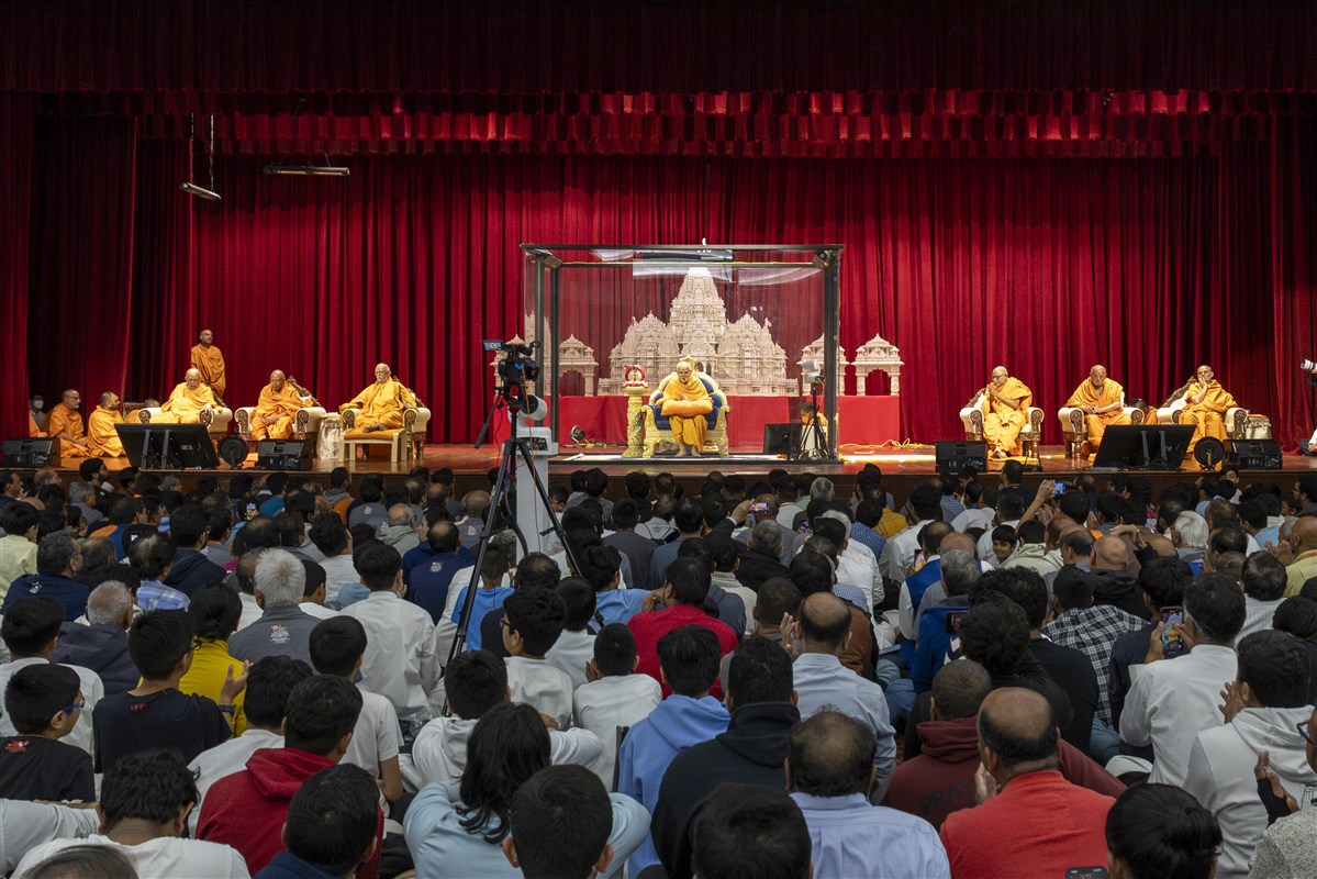 A swami sings a kirtan while Swamishri is engrossed in darshan