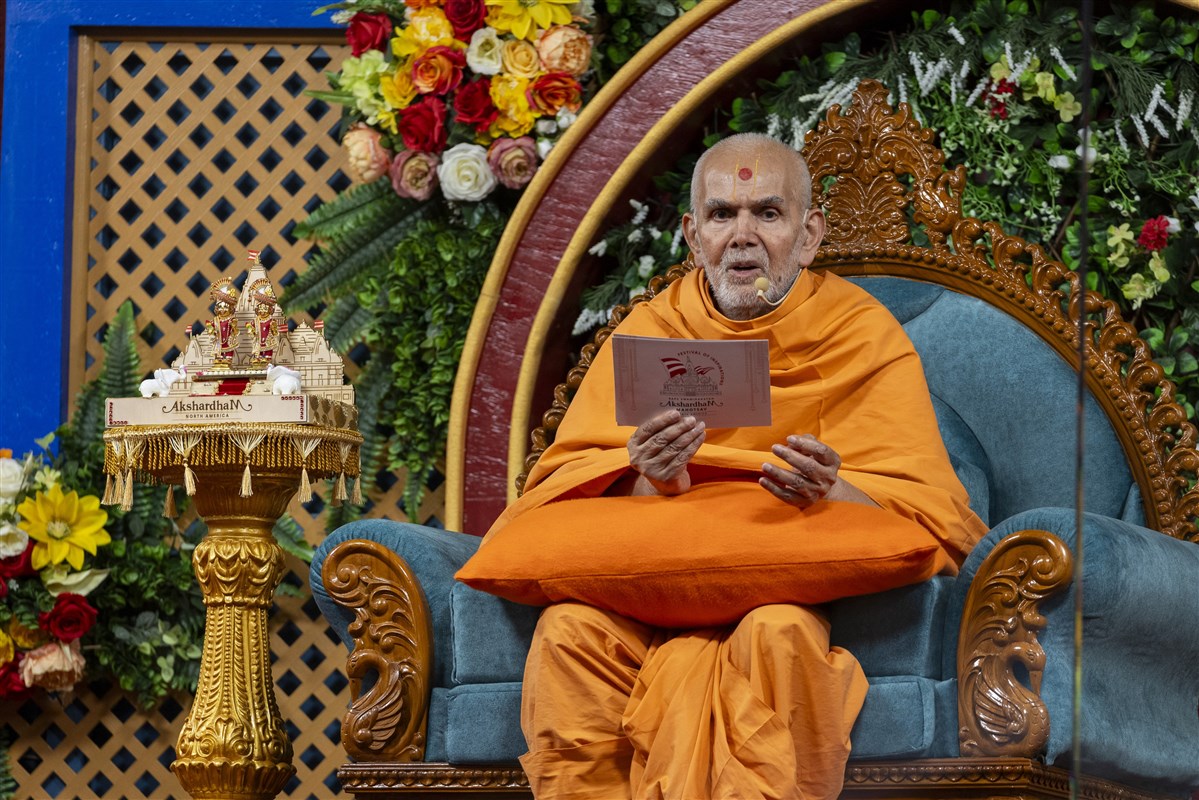 Swamishri attentively listens to the sadhana mantra and daily prayer