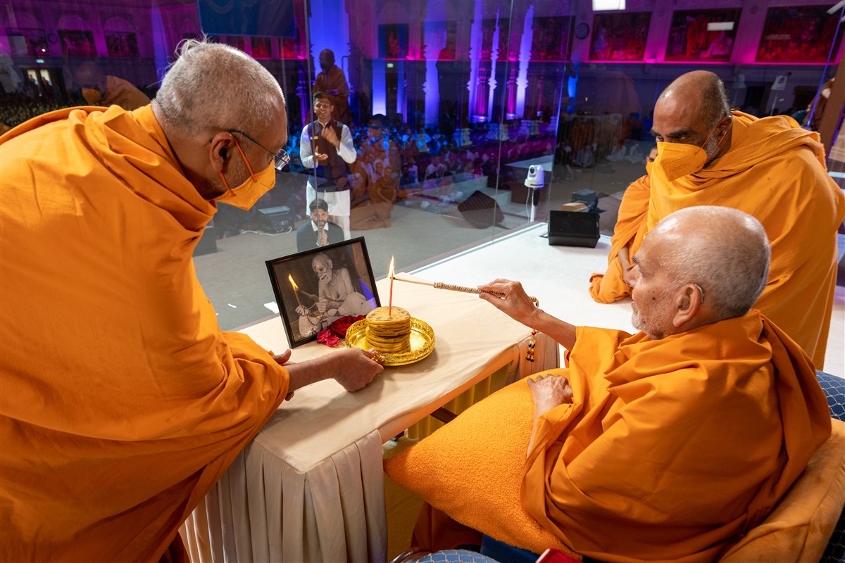 Swamishri attentively listens to the narrator as he introduces the Yogi Jayanti evening programme