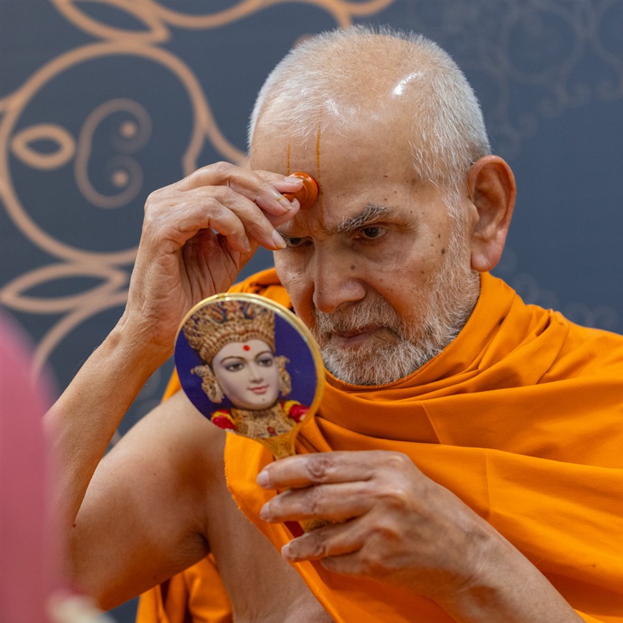 Param Pujya Mahant Swami Maharaj performs the morning arti