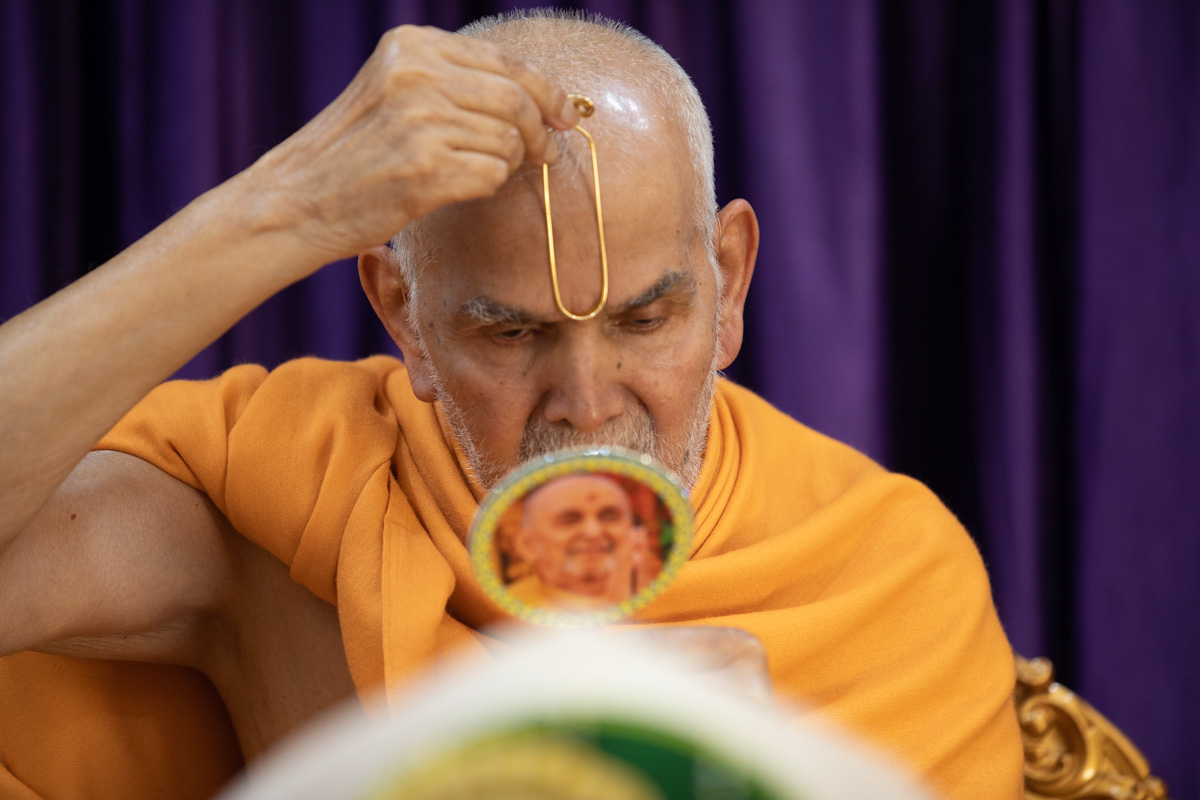 Swamishri engrossed in darshan of Shri Harikrishna Maharaj and Shri Gunatitanand Swami