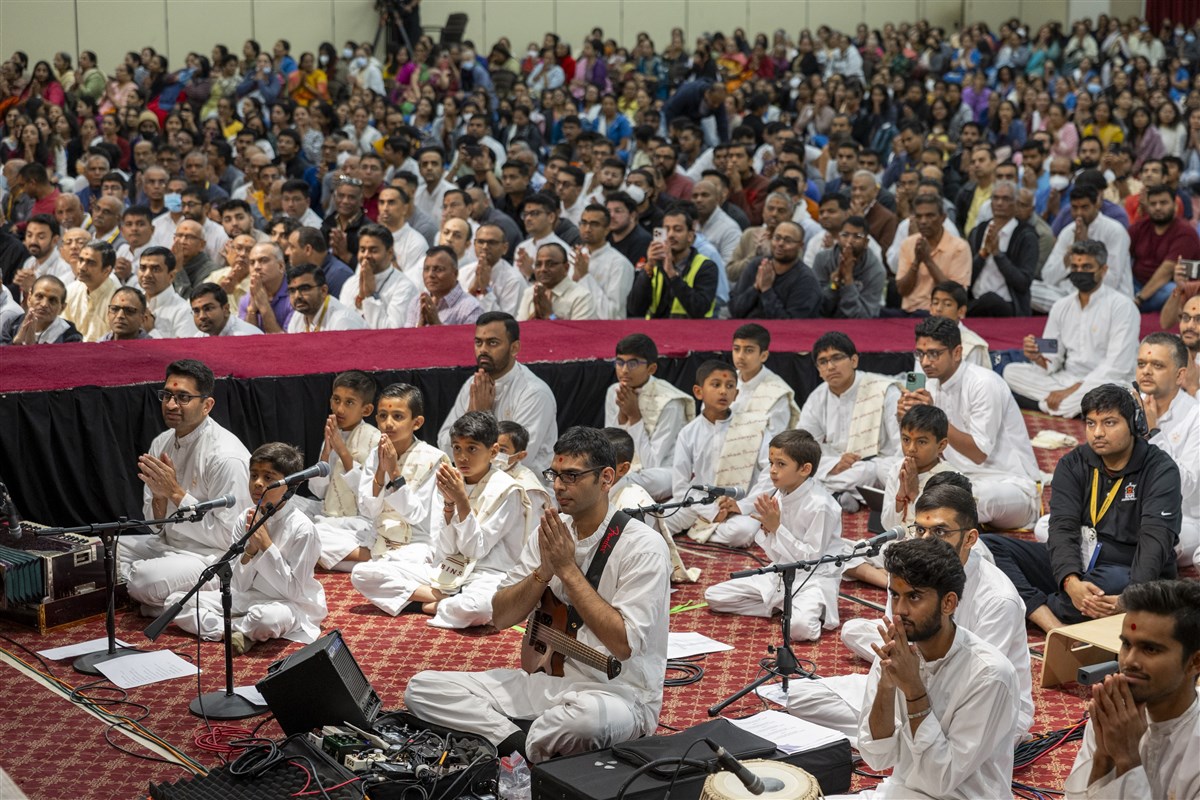 A child leads everyone in reciting the sadhana mantra and daily prayer in Swamishri's puja