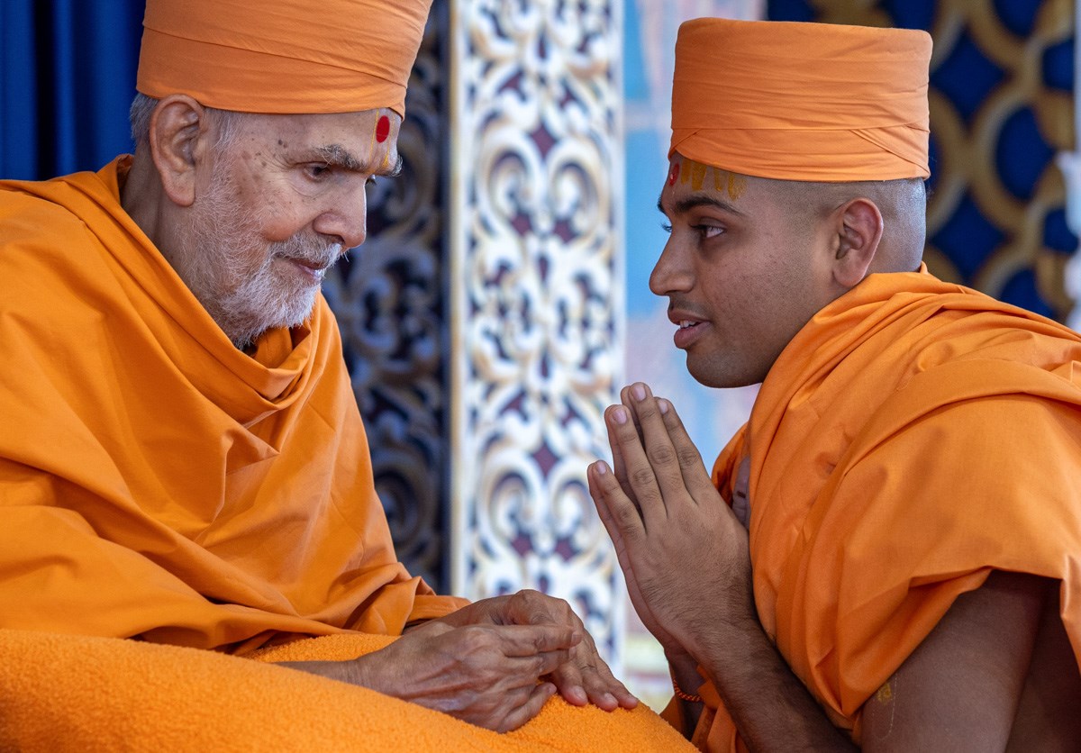 Swamishri gives diksha mantra and blessings to a newly initiated swami