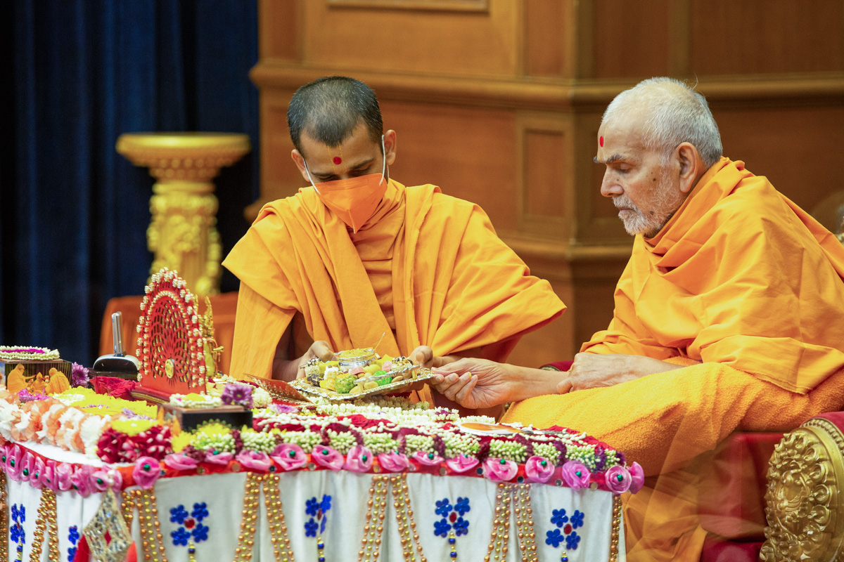 Swamishri engrossed in darshan of Shri Harikrishna Maharaj and Shri Radha-Krishna Dev