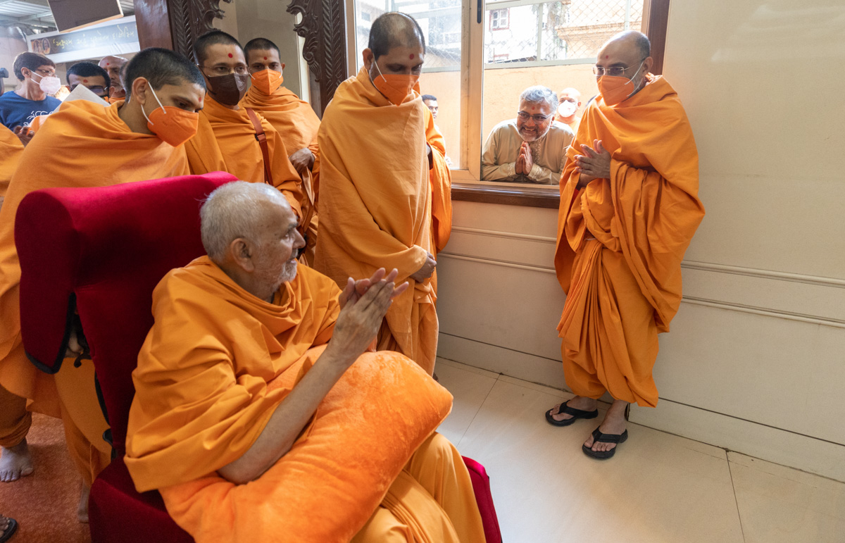 Pujya Bhaktipriya Swami (Kothari Swami) honors Swamishri with a garland
