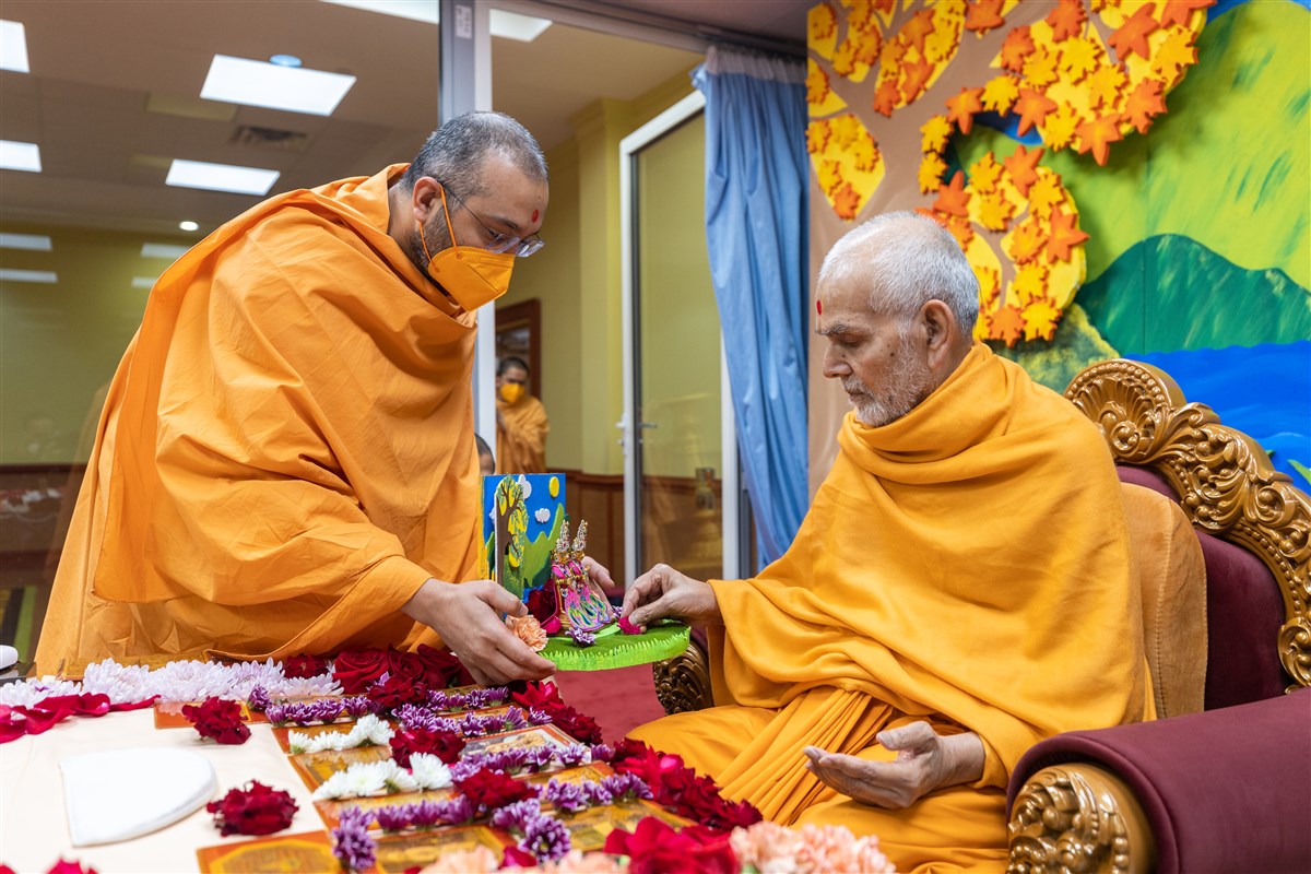 Swamis present Swamishri with a garland
