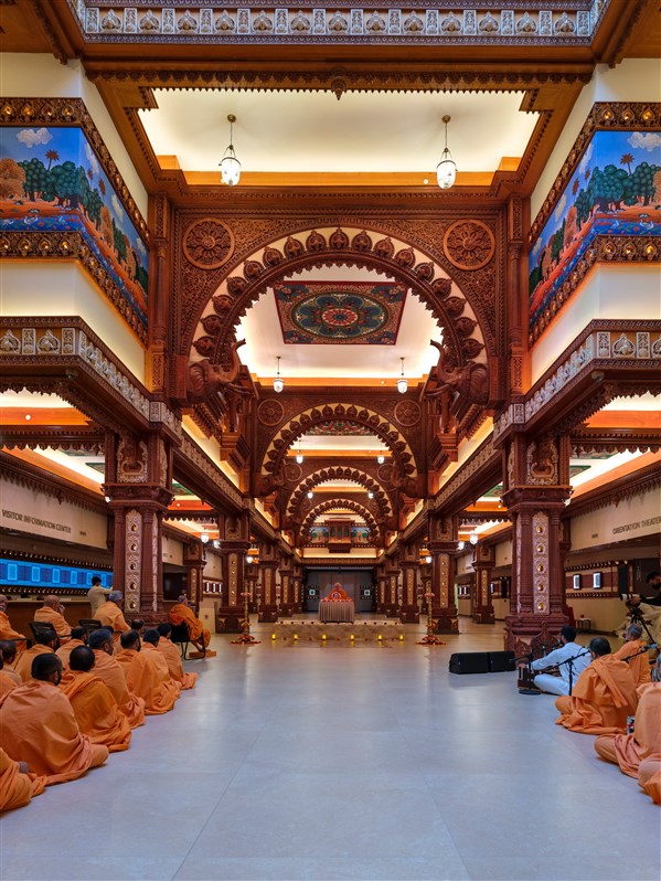 Swamishri performs puja in the intricately handcrafted Welcome Center