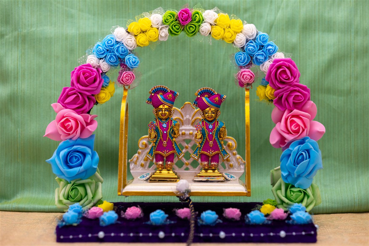 Swamishri swings Shri Harikrishna Maharaj and Shri Gunatitanand Swami Maharaj on a hindolo