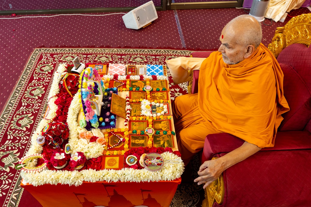 Swamishri engrossed in darshan of Shri Harikrishna Maharaj and Shri Gunatitanand Swami Maharaj