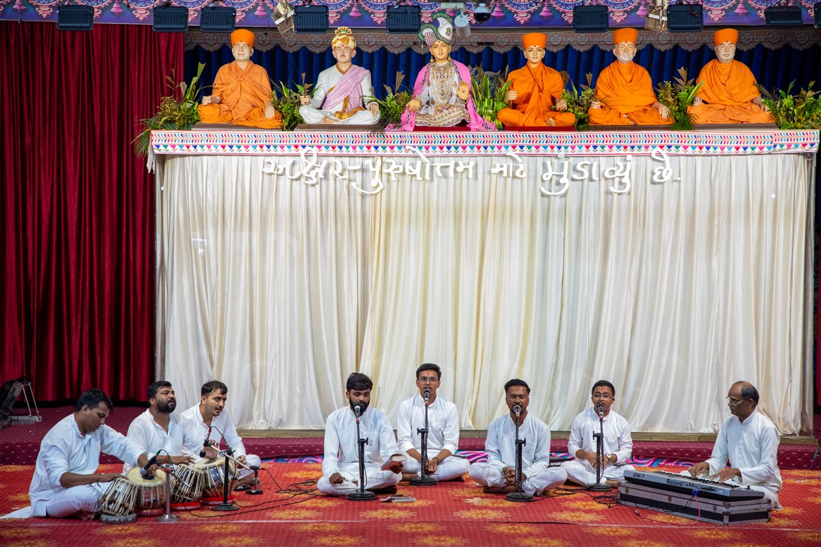 Children and devotees sing kirtans in Swamishri's morning puja