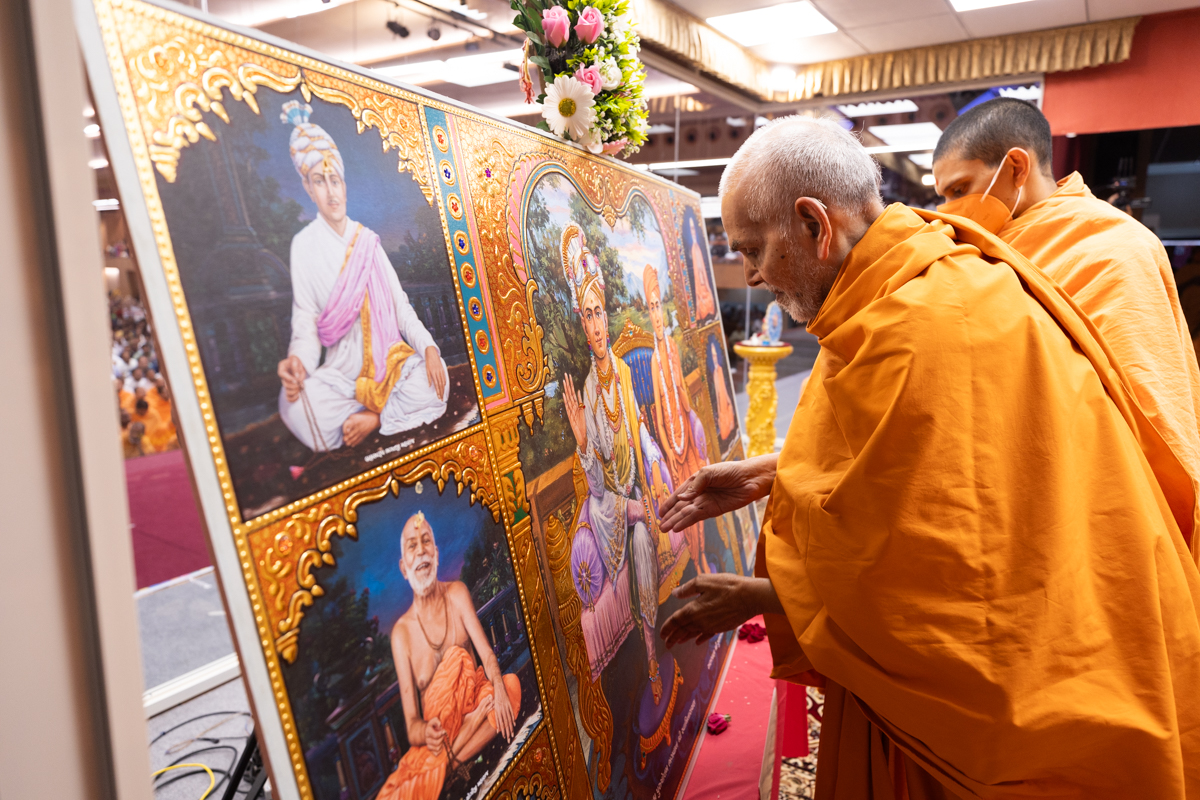 Swamishri engrossed in darshan of Bhagwan Swaminarayan, Aksharbrahma Gunatitanand Swami and Shri Gopalanand Swami