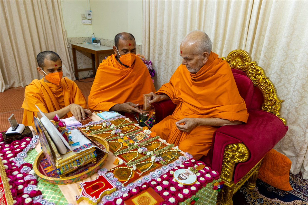 Before departing from Gondal, Swamishri arrives for darshan in the Shri Akshar Deri