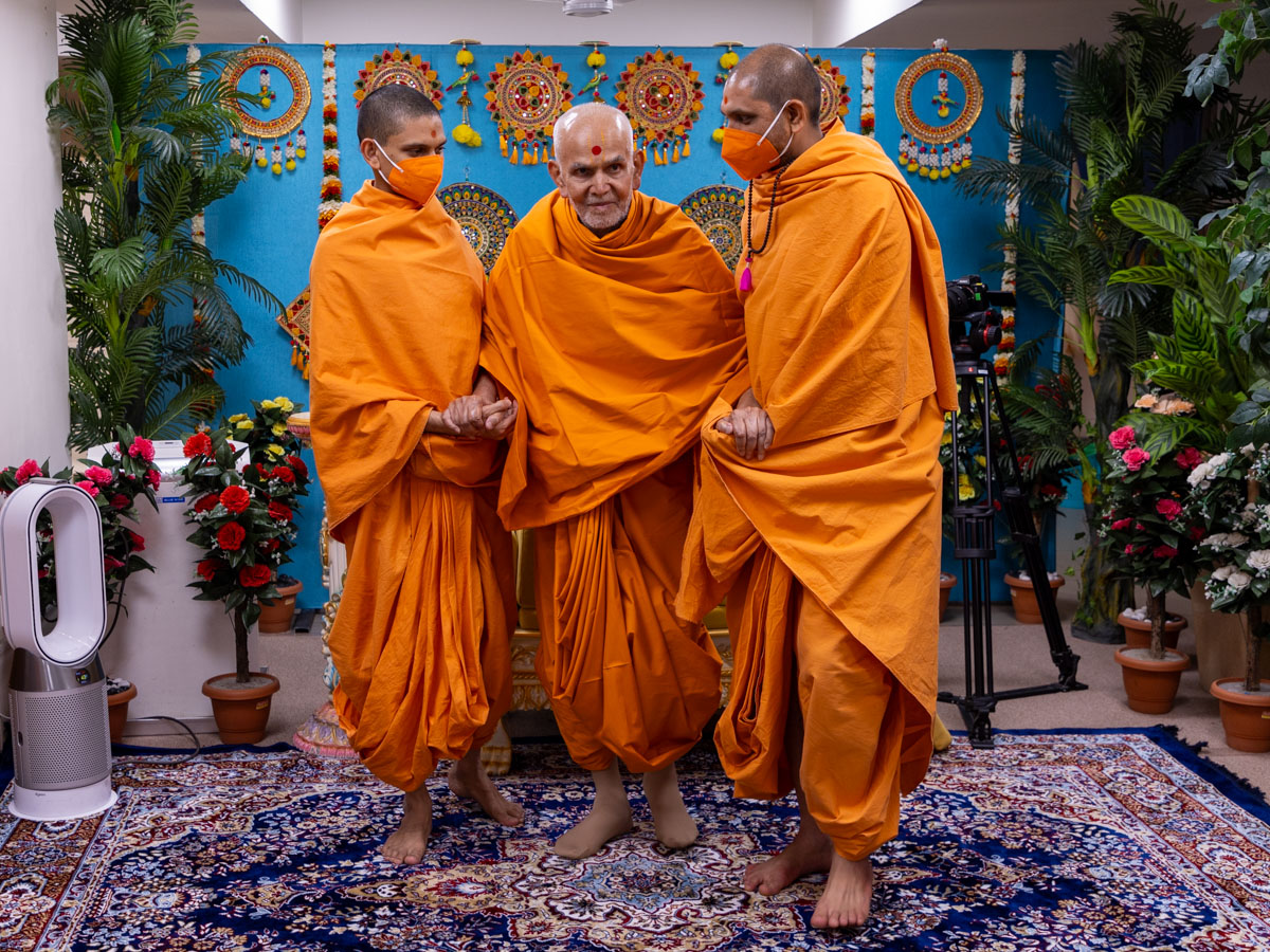 Param Pujya Mahant Swami Maharaj performs the morning arti
