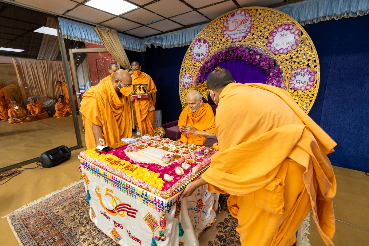 Swamishri presents the memento to Shri Bhupendrabhai Patel