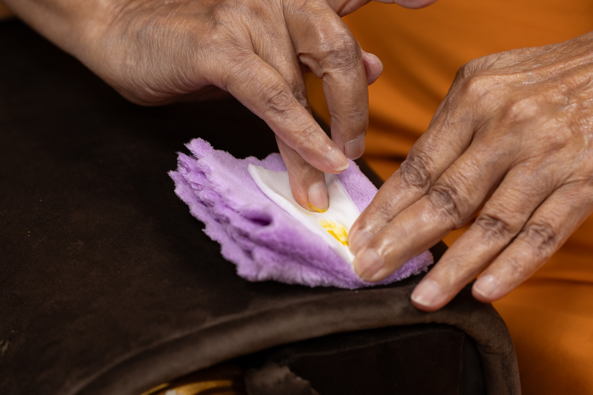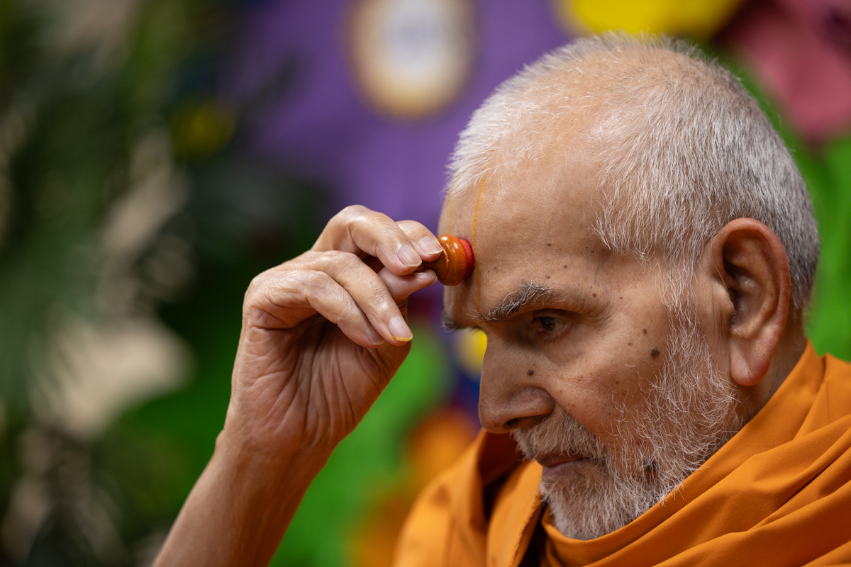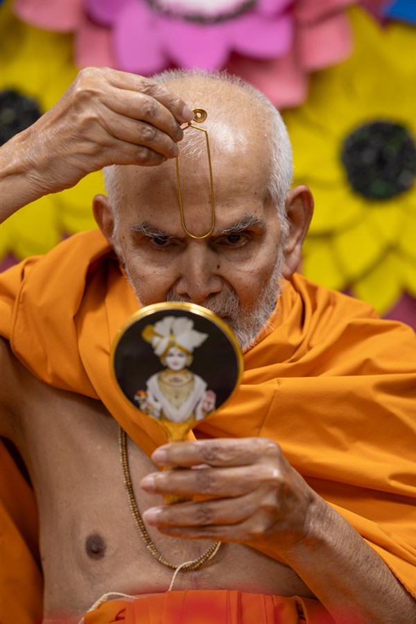 Swamishri applies chandan on a tilakiyu at the beginning of his daily puja