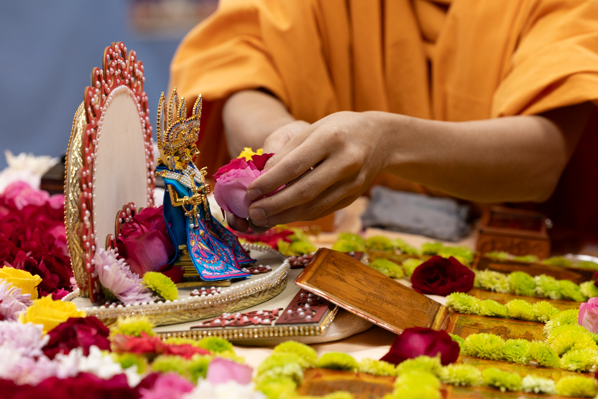 Swamishri offers a flower to Shri Harikrishna Maharaj and Shri Gunatitanand Swami Maharaj