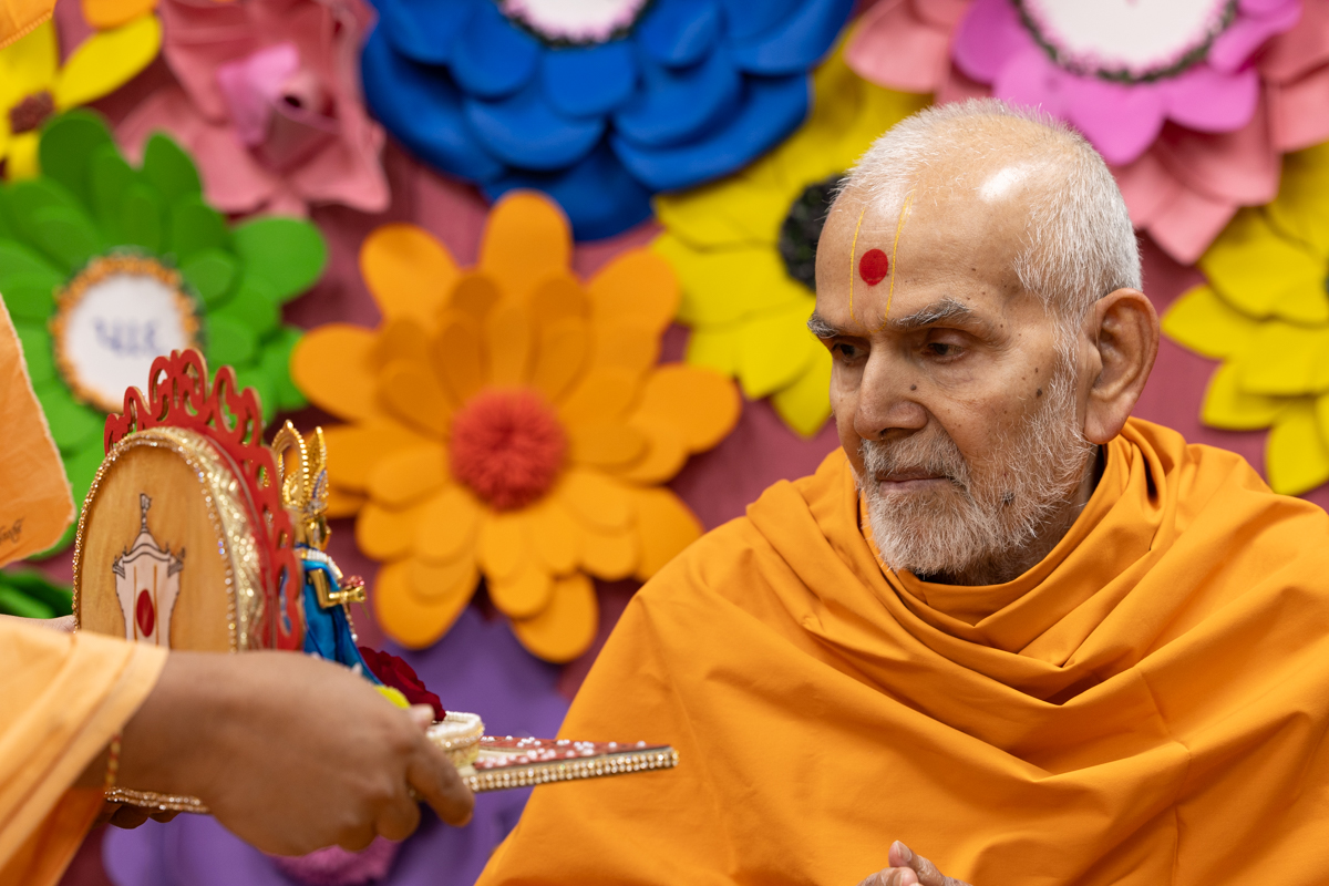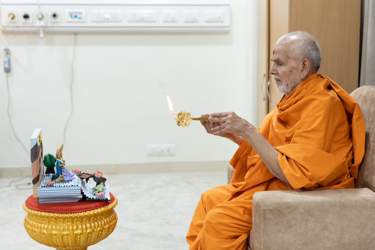 Pujya Tyagvallabh Swami doing Swamishri's puja darshan