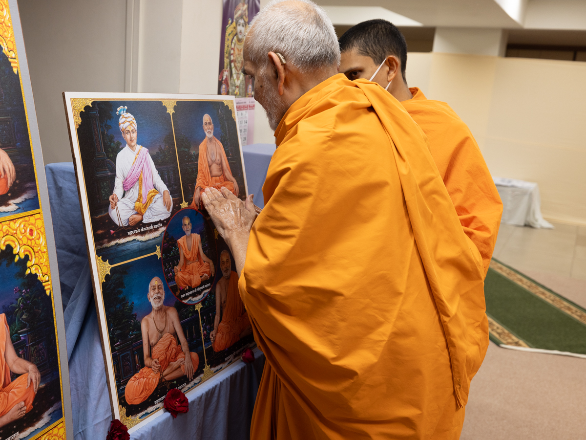 Swamishri engrossed in darshan of Shri Harikrishna Maharaj and Shri Gunatitanand Swami Maharaj