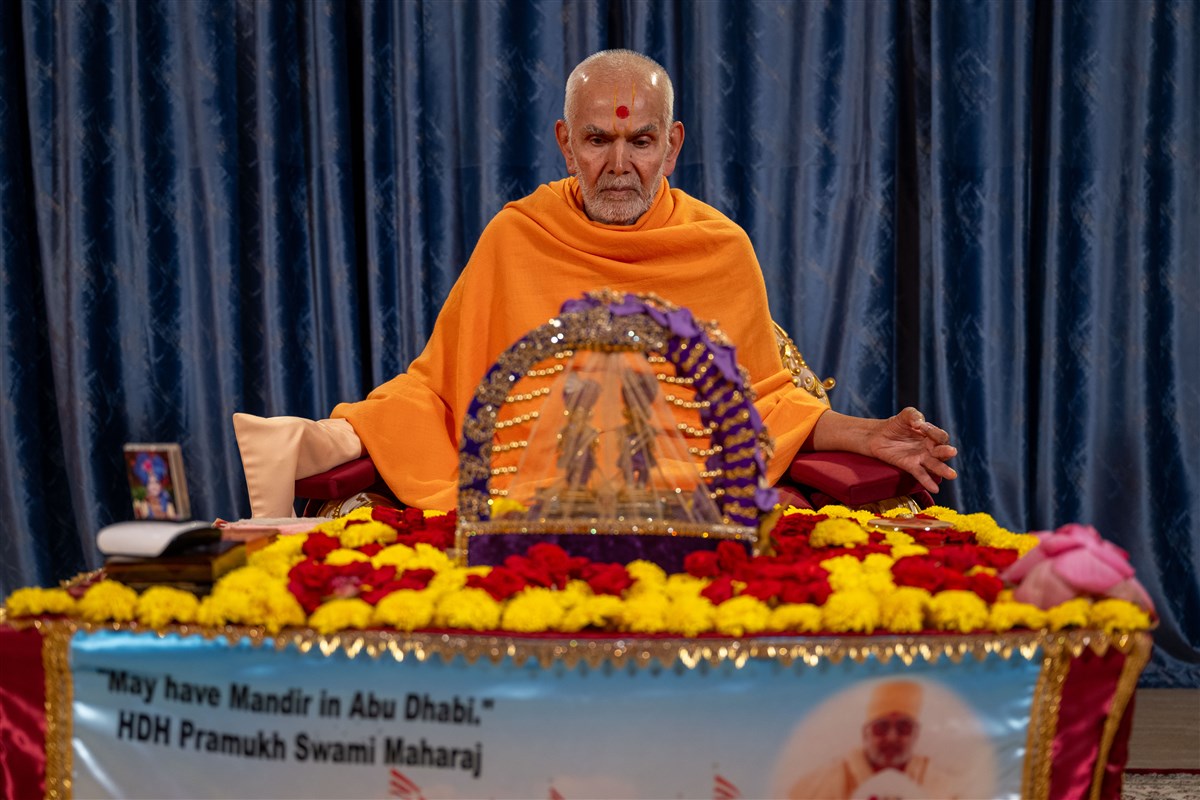 Swamishri performs the evening arti of Shri Harikrishna Maharaj and Shri Gunatitanand Swami Maharaj