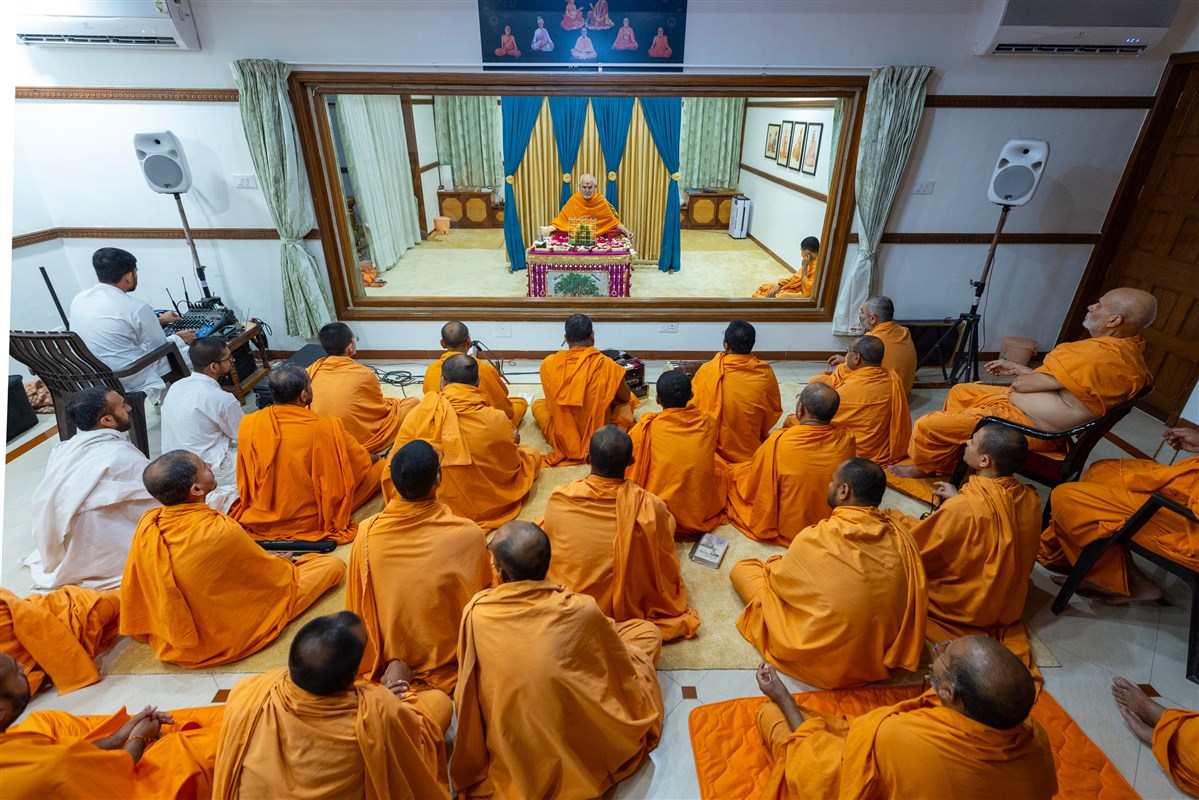 Param Pujya Mahant Swami Maharaj performs the morning arti