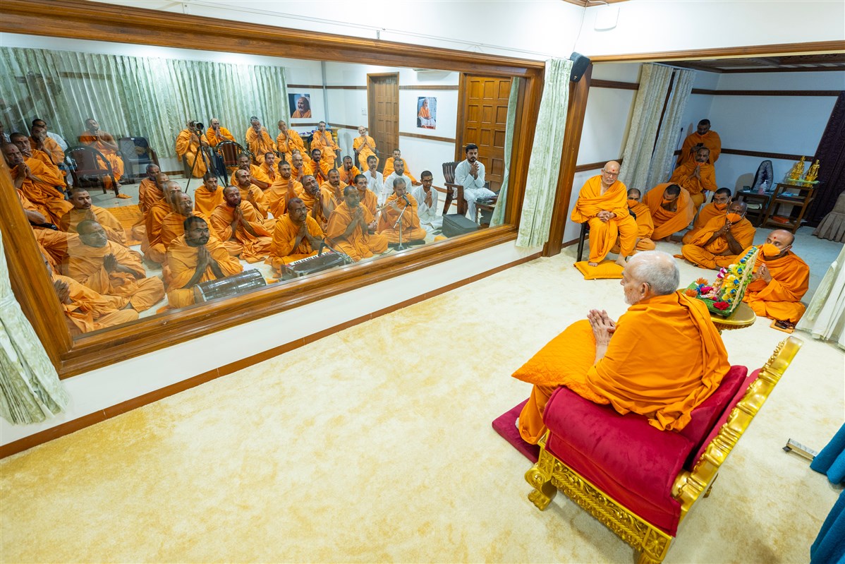 Pujya Ghanshyamcharan Swami and swamis doing darshan of Swamishri