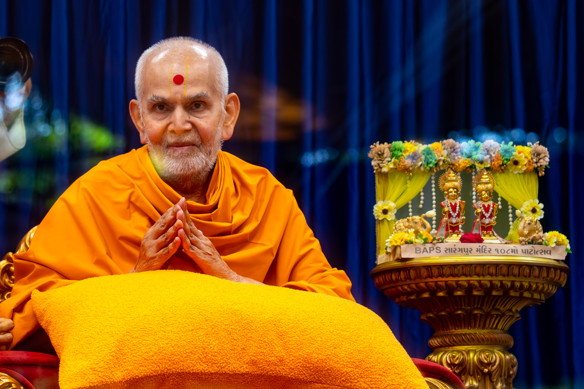 Swamishri engrossed in darshan of Shri Varninath Maharaj and Shri Gopinath Bhagwan