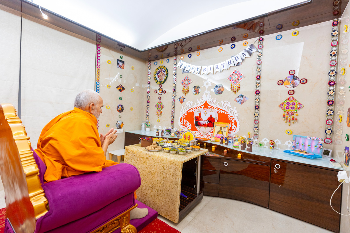 Swamishri engrossed in darshan at the beginning of his daily puja
