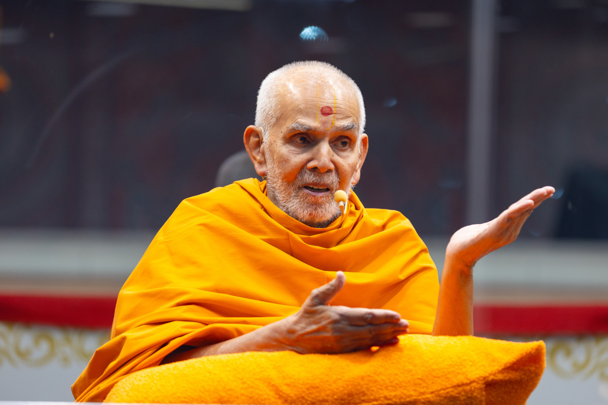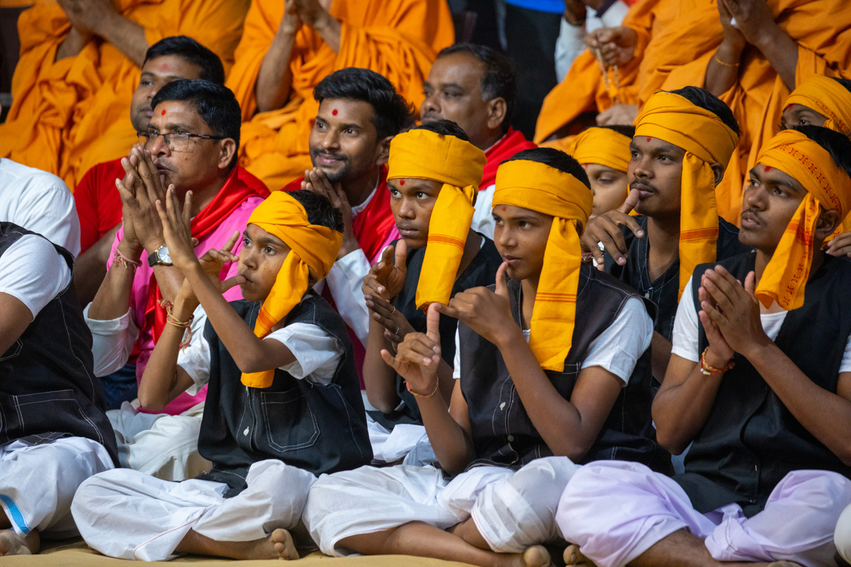 Children lead everyone in reciting the sadhana mantra and daily prayer in Swamishri's puja