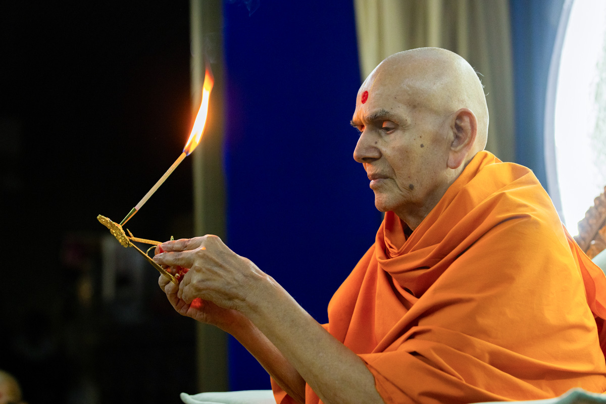 Swamishri offers thal to Shri Akshar-Purushottam Maharaj