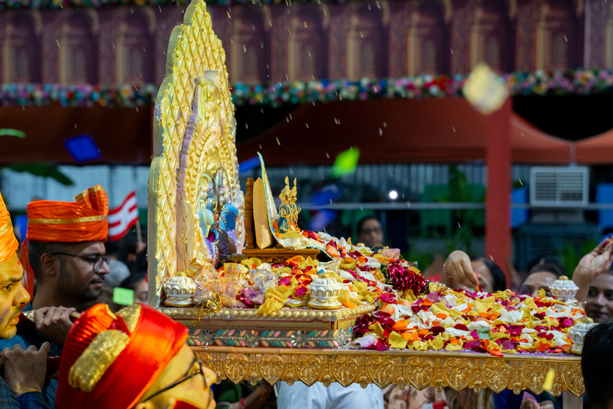 Devotees shower flower petals Shri Akshar-Purushottam Maharaj