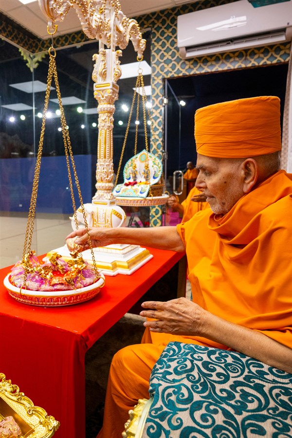 Param Pujya Mahant Swami Maharaj performs the morning arti