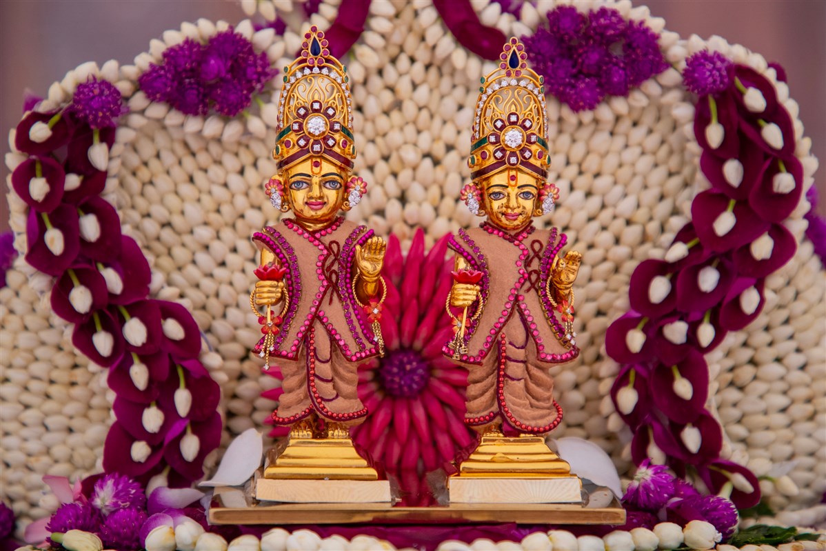 Swamishri engrossed in darshan of Shri Varninath Maharaj and Shri Gopinath Bhagwan
