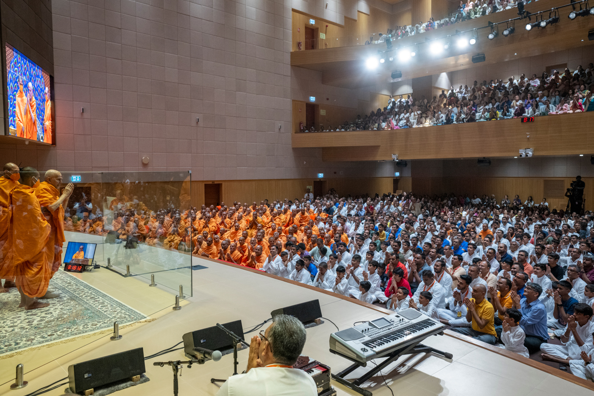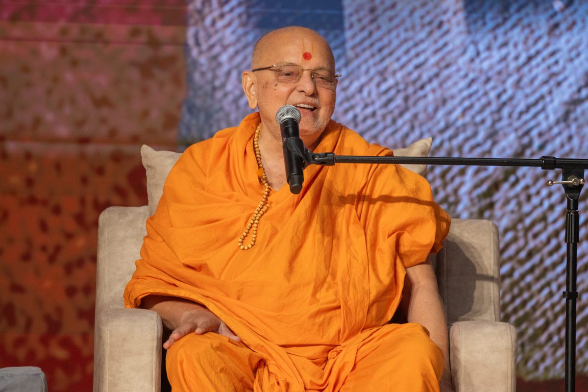Adarshjivan Swami poses questions to Swamishri during an interactive session