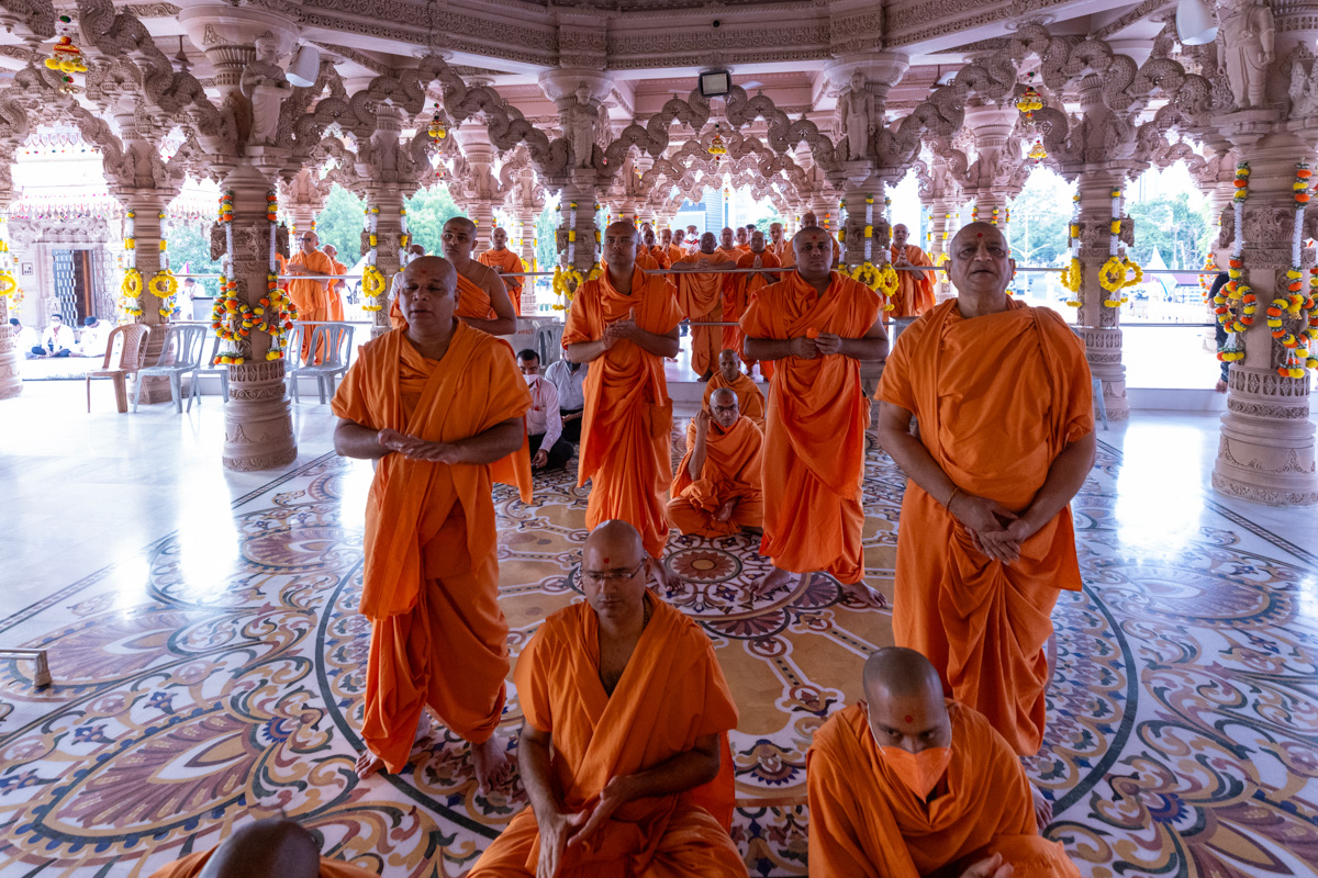 Swamishri and swamis perform pranayama to celebrate the International Day of Yoga