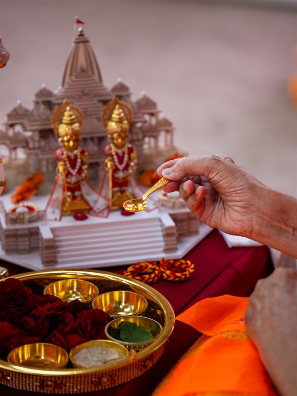 Swamishri during Shri Ram Mandir Pranpratishtha celebration assembly