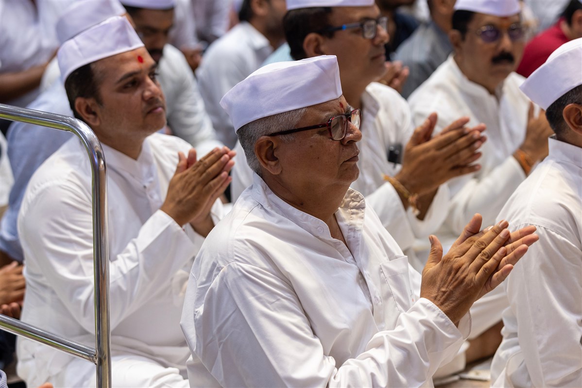 Swamishri engrossed in darshan of Shri Harikrishna Maharaj, Bhagwan Shri Krishna and Shri Radhaji