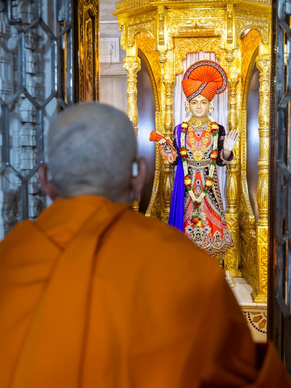 Swamishri engrossed in darshan of Shri Dharmakul