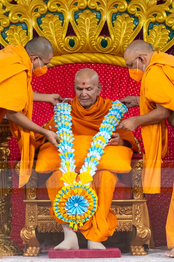 Devotees honor Swamishri with garlands
