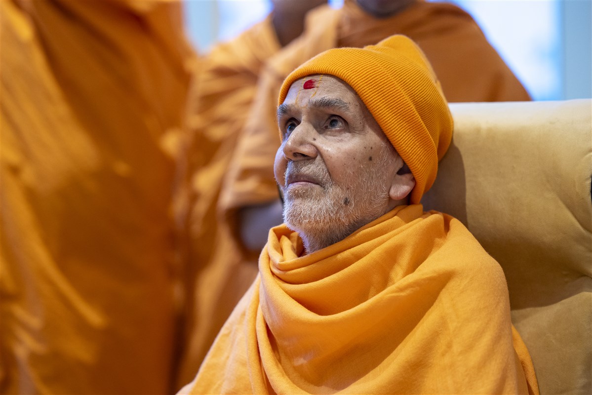 Param Pujya Mahant Swami Maharaj performs the morning arti