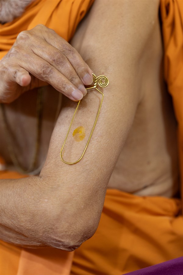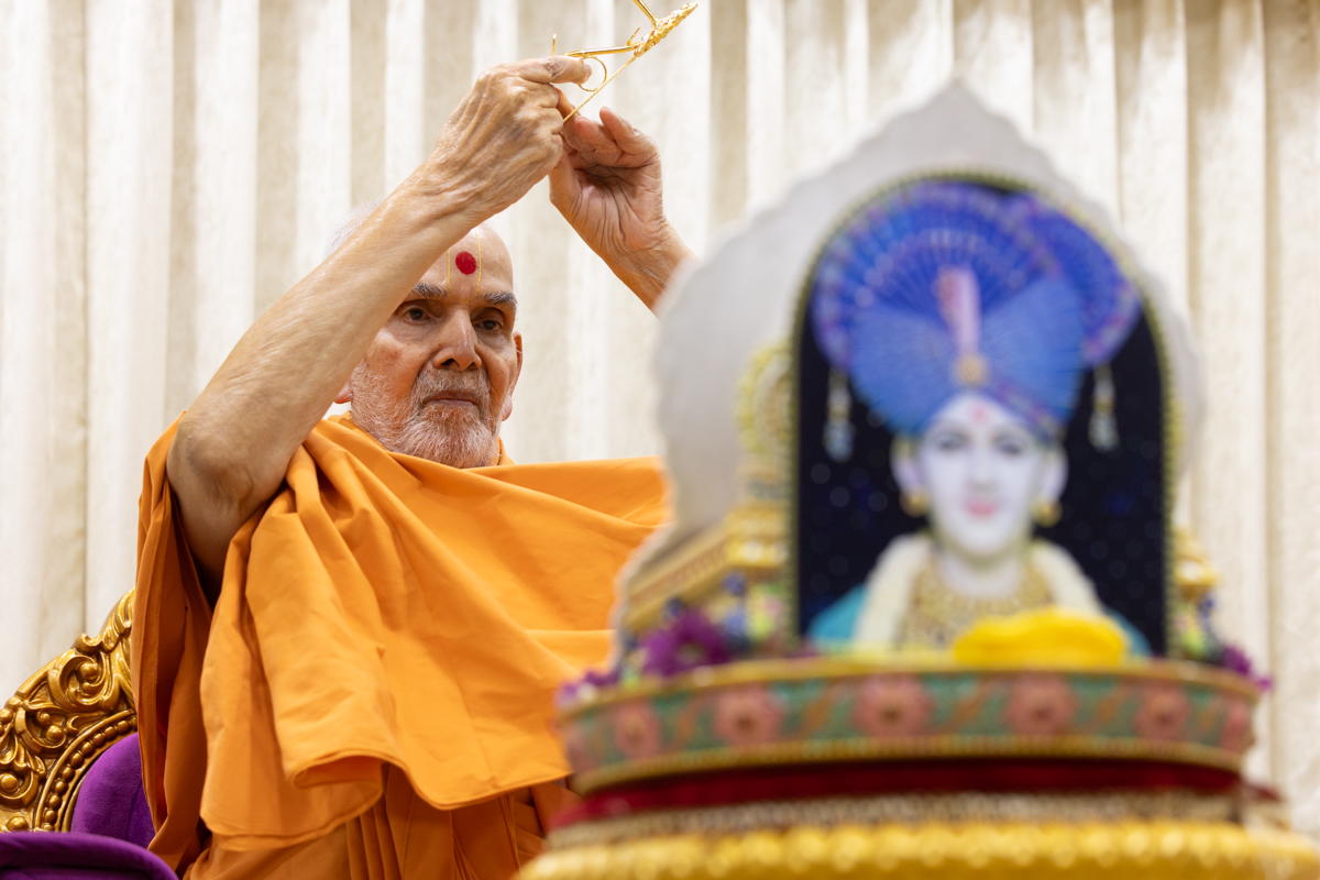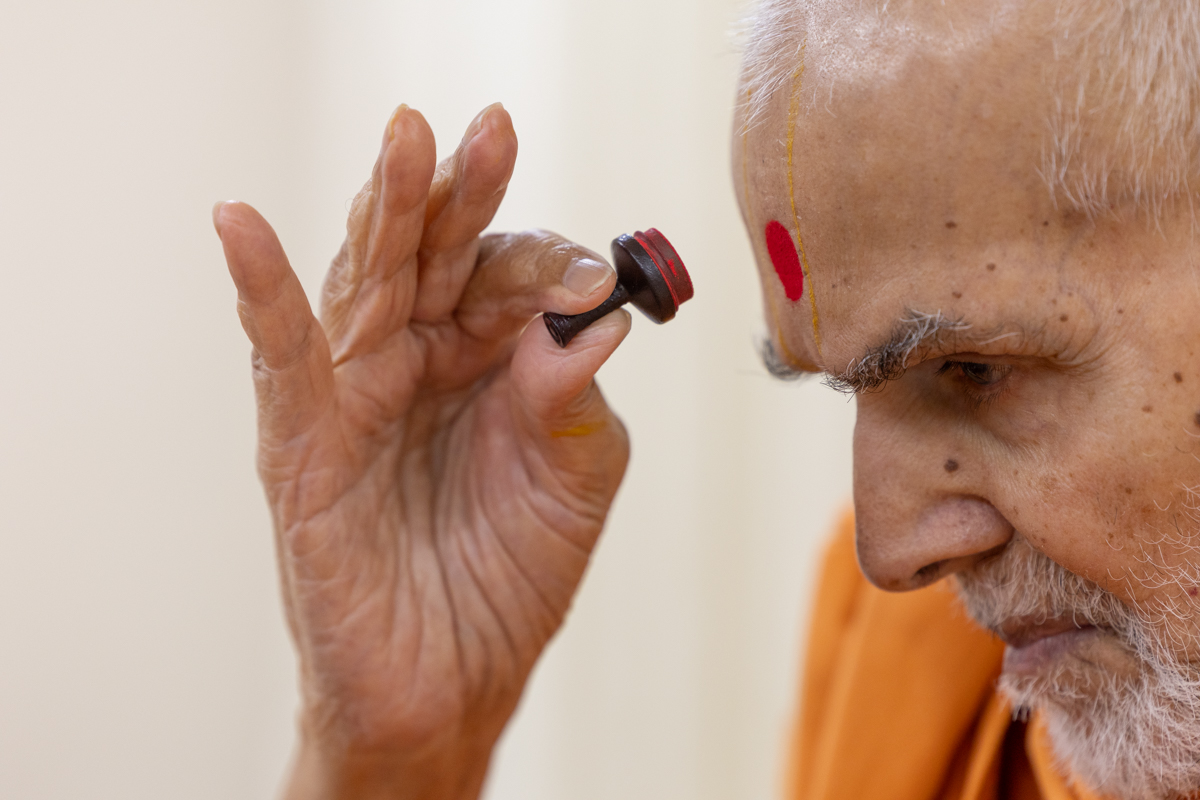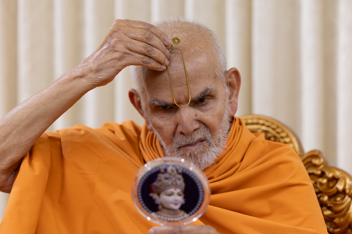 Param Pujya Mahant Swami Maharaj applies a tilak on his forehead