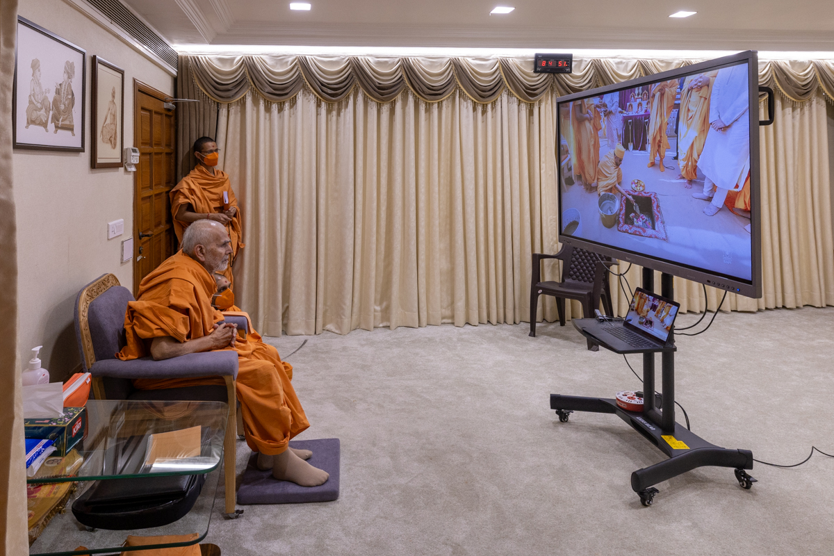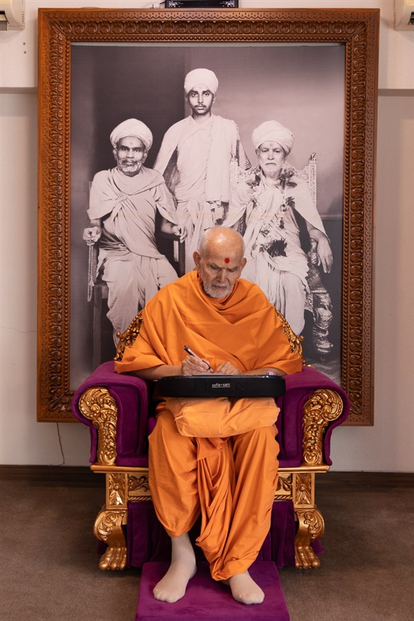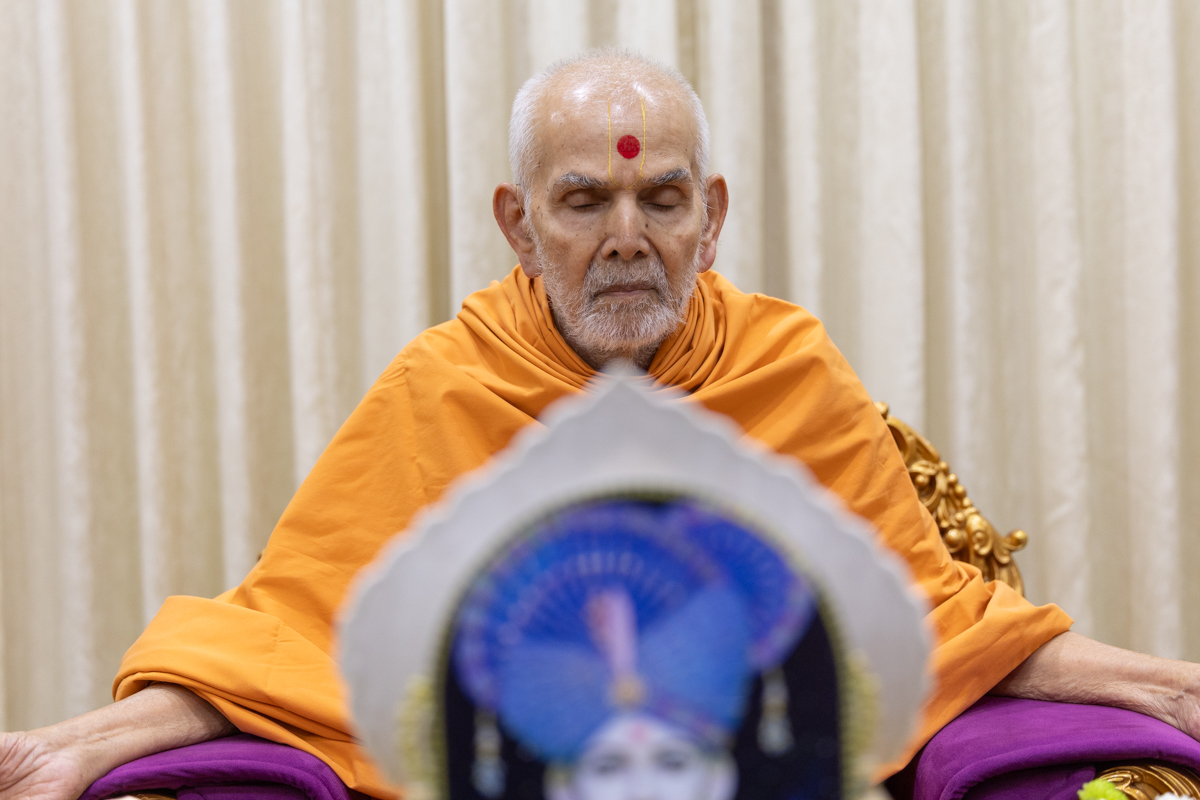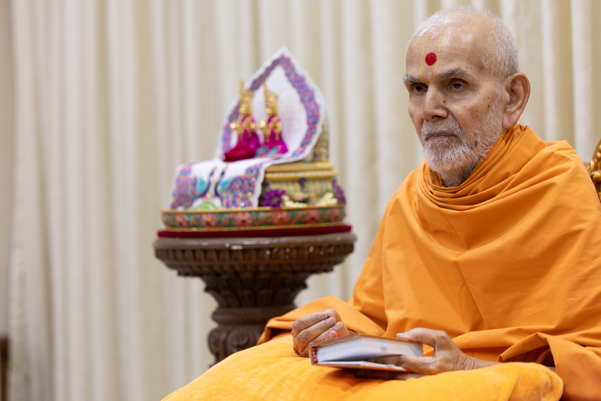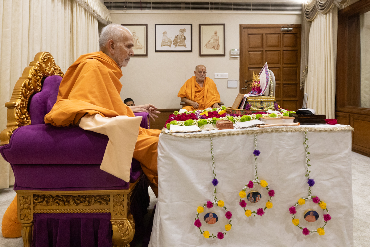 Swamishri engrossed in darshan of Shri Harikrishna Maharaj and Shri Gunatitanand Swami Maharaj