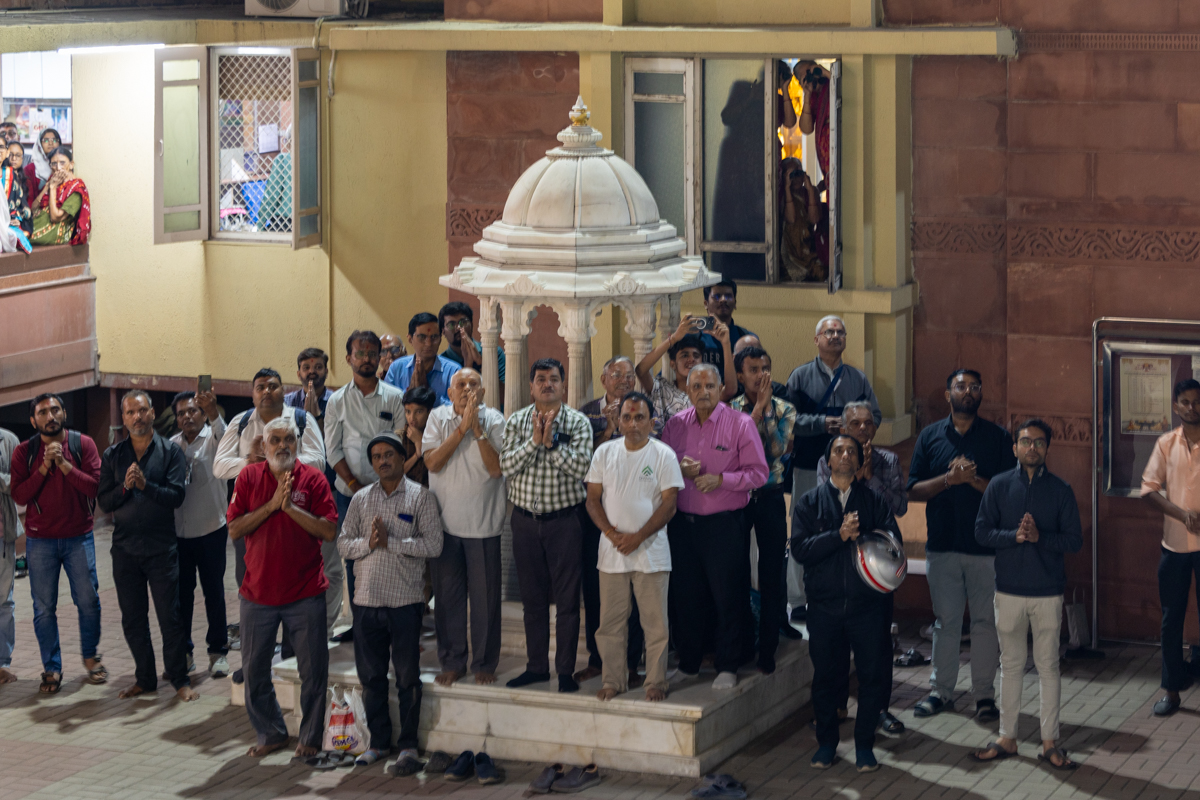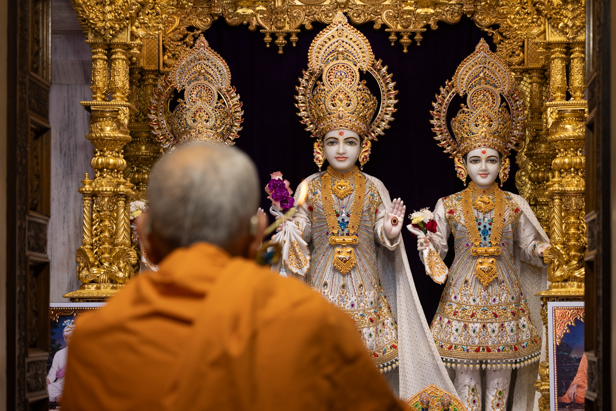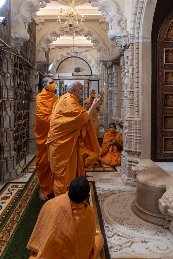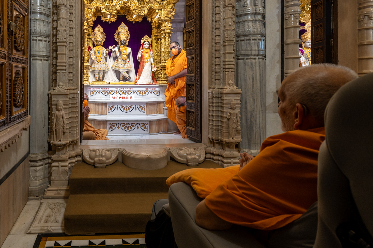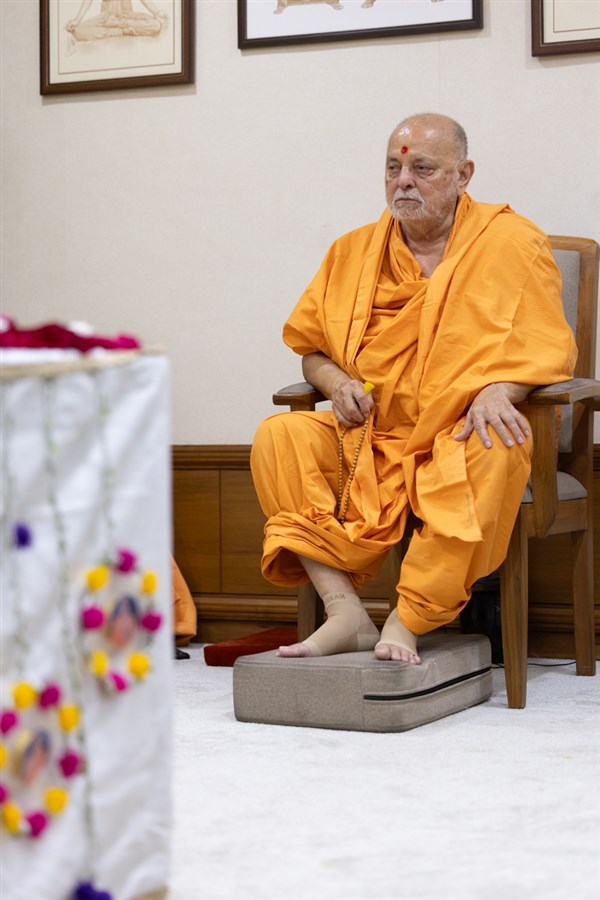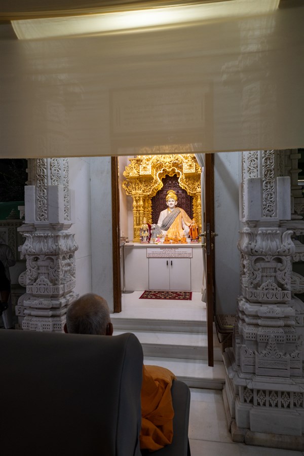 Pujya Ishwarcharan Swami doing Swamishri's puja darshan