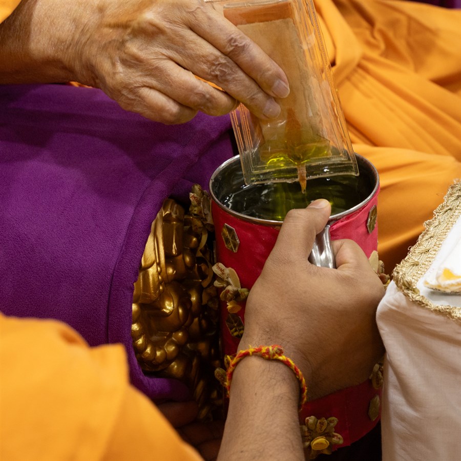 Swamishri sanctifies water with the holy relics of Bhagwan Swaminarayan and the Guru Parampara