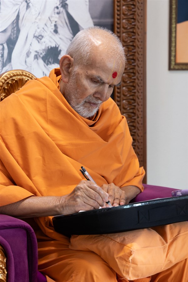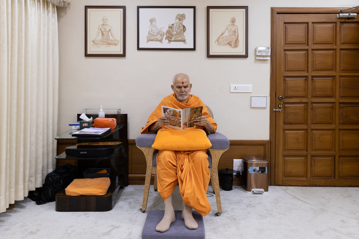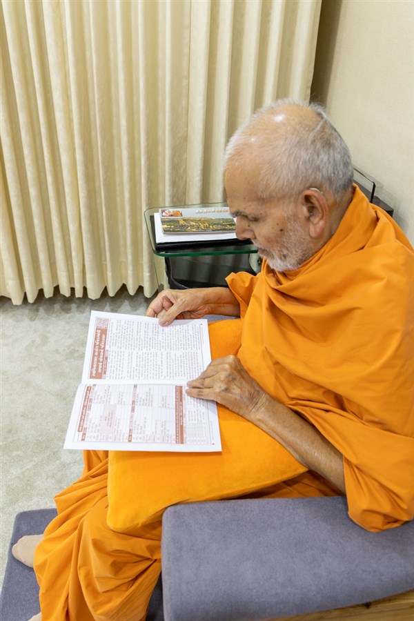 Swamishri reads 'Sahajanand Sudha', the monthly newsletter for Satsang Pravrutti karyakars