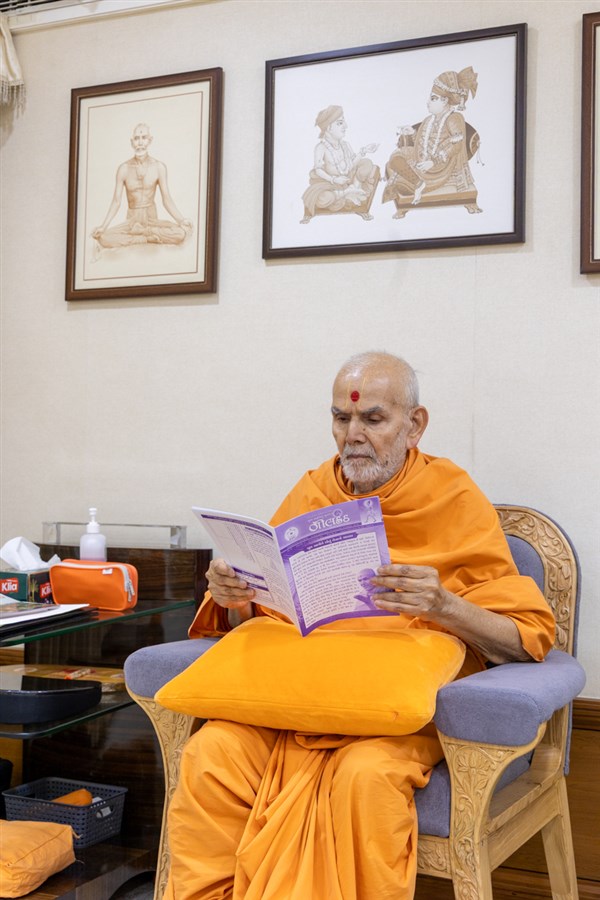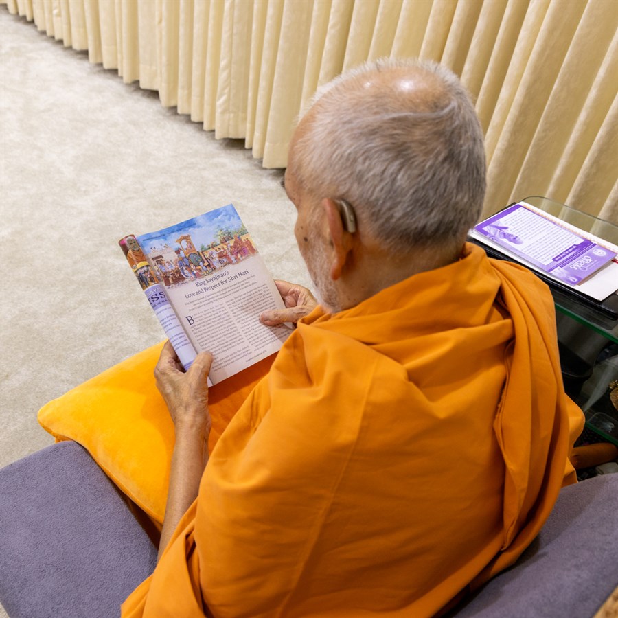 Swamishri reads the latest issue of 'Swaminarayan Bliss'