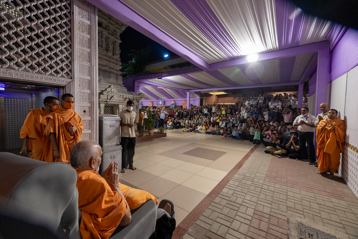 Swamishri engrossed in darshan of Shri Harikrishna Maharaj, Bhagwan Shri Krishna and Shri Radhaji