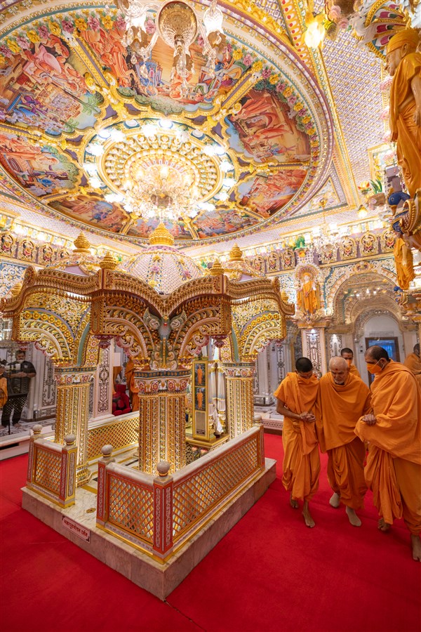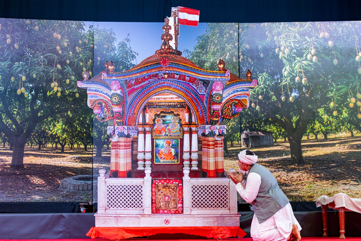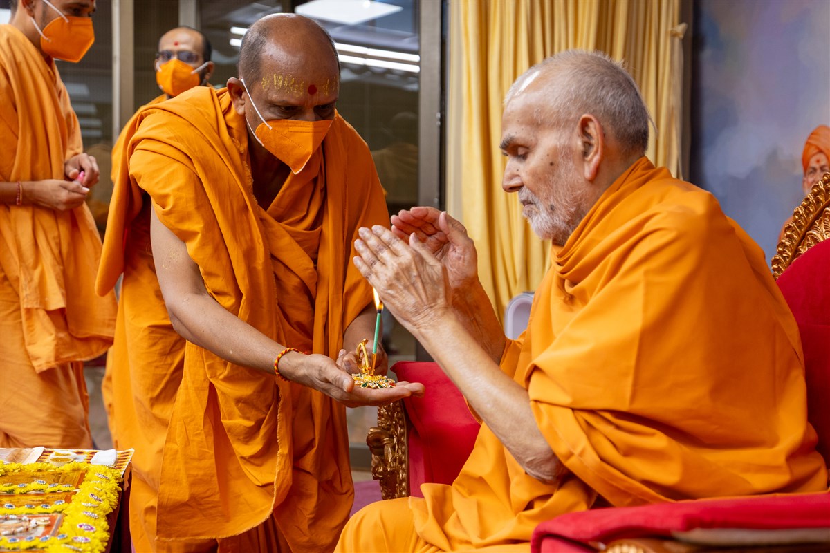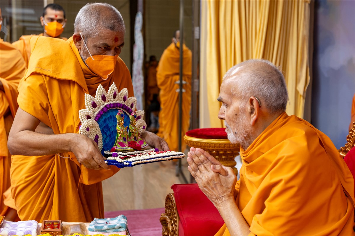 Swamishri offers thal to Shri Akshar-Purushottam Maharaj